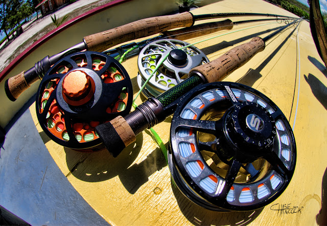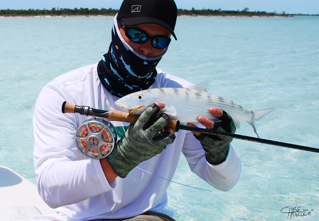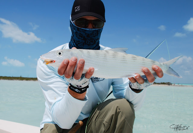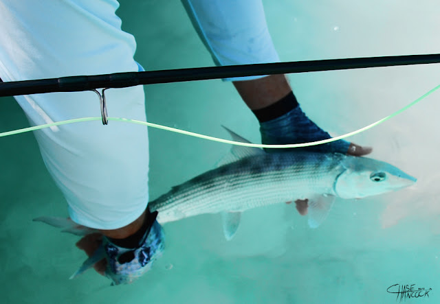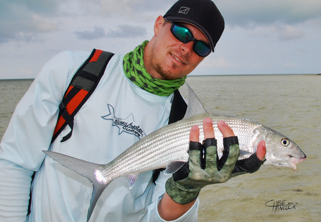 When we got back Eddie was pooped so he took a little break and I headed out on my own. About 100 yards off the beach from the lodge I met up with Dan and Tim, two of the other guys that went with us. We got to talking and he was telling me about how he had just got a nice bone a few minutes ago and not far from we were standing. About that time I turn around and a school of fish are headed straight at us, I quickly strip off some line and make a 20 foot cast at fast approaching fish. Right when I think they are about to spoke two fish dart after the fly and I hook up. Not a bad way to start off the day wading haha!