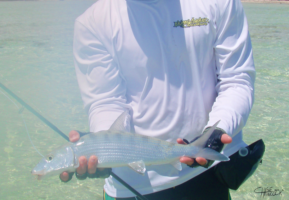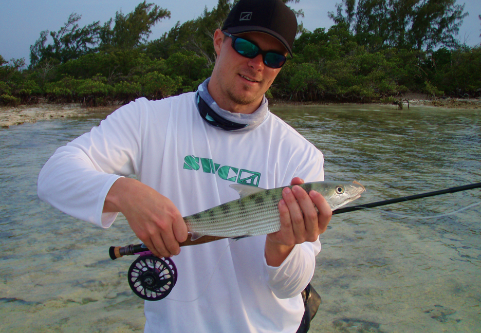 When we got back Eddie was pooped so he took a little break and I headed out on my own. About 100 yards off the beach from the lodge I met up with Dan and Tim, two of the other guys that went with us. We got to talking and he was telling me about how he had just got a nice bone a few minutes ago and not far from we were standing. About that time I turn around and a school of fish are headed straight at us, I quickly strip off some line and make a 20 foot cast at fast approaching fish. Right when I think they are about to spoke two fish dart after the fly and I hook up. Not a bad way to start off the day wading haha!