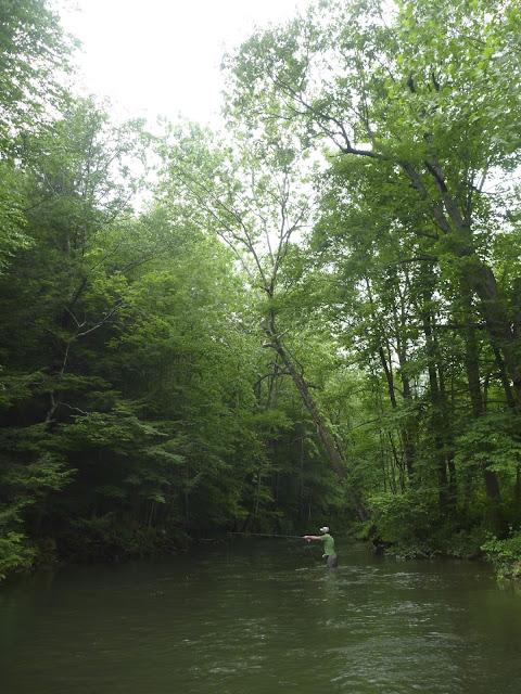 When I arrived stream side for my first time fishing magicicadas, I could hear them in the trees. The noise was unmistakable and resonated from a hill covered in pines. The sci-fi sound came and went hourly throughout the day. Interestingly enough, the hill was the only section in the area where the sound was coming from. It was also where cicadas could be found in bushes, leaves, and littering the ground. Occasionally, you could even find a live cicada struggling as it floated downstream. Elsewhere, you wouldn’t even know that there were cicadas in the area. A half-mile downstream, I found another grouping of cicadas at the base of the mountain. In between those two areas is where I decided to concentrate my fishing efforts.
