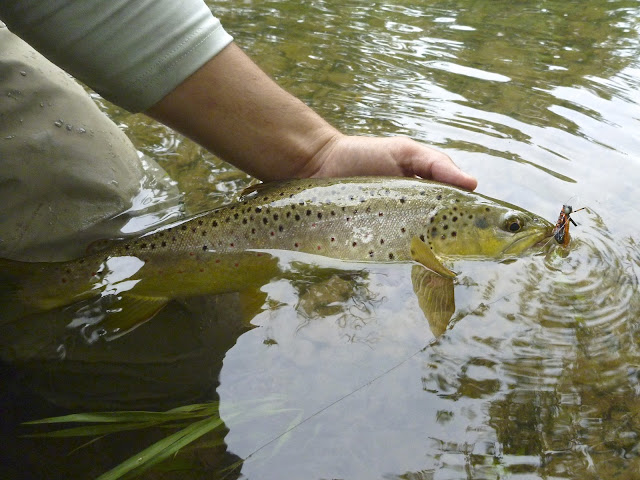 After my first cast into the stream, I knew I was in for a good day of fly fishing. A 17 inch wild brown gently sipped my size 6 cicada and the battle was on. As the day progressed, I had vicious attacks on my dry fly in every single good looking lie. On several occasions, fish would miss on their 1st, 2nd, and sometimes 3rd attempts before wising up to the folly at the end of my line. It was phenomenal fishing, and I was clearly the first person to toss a cicada on the stream. My brother finally got his act together and met me on the stream to catch a few beautiful browns of his own. Thunderstorms finally drove us off the water, but not before we were both satisfied with the action. We found out later that we weren’t alone. Other anglers had keyed in on the insects as well and found success upstream of us.