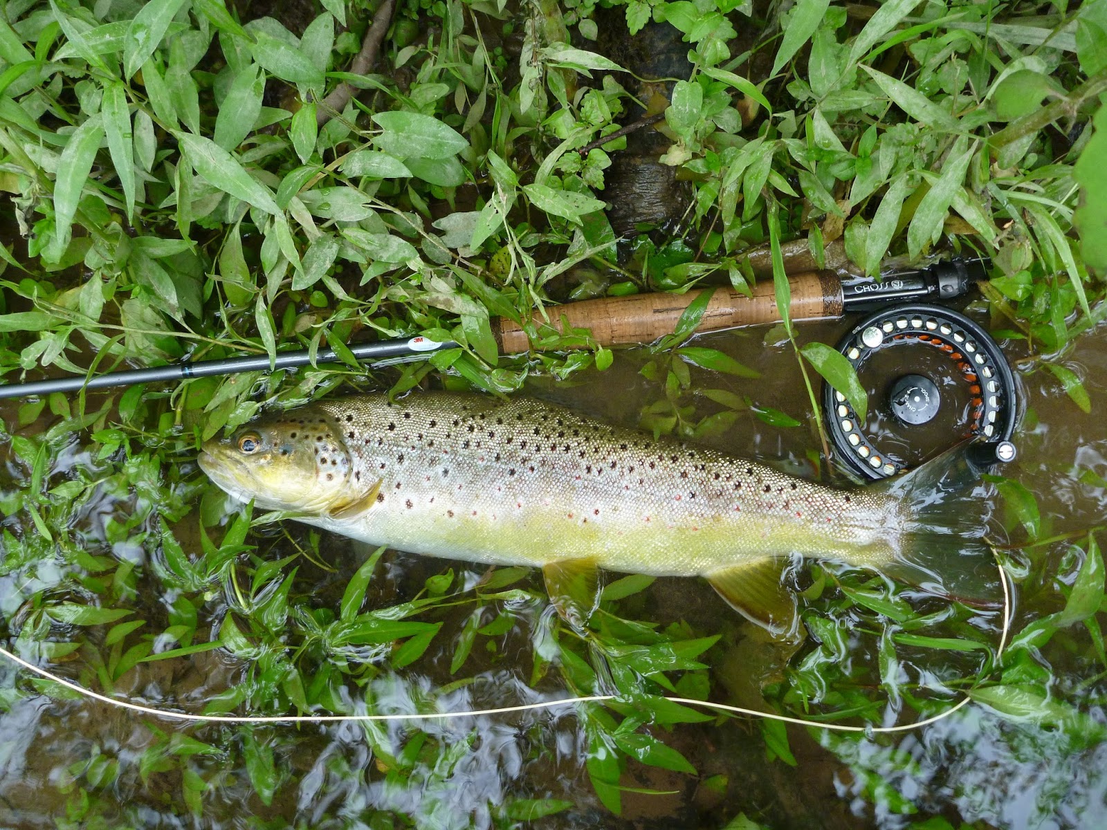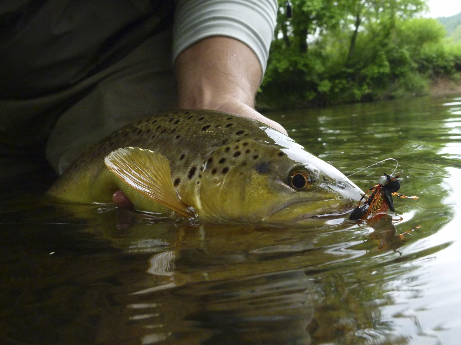 After my first cast into the stream, I knew I was in for a good day of fly fishing. A 17 inch wild brown gently sipped my size 6 cicada and the battle was on. As the day progressed, I had vicious attacks on my dry fly in every single good looking lie. On several occasions, fish would miss on their 1st, 2nd, and sometimes 3rd attempts before wising up to the folly at the end of my line. It was phenomenal fishing, and I was clearly the first person to toss a cicada on the stream. My brother finally got his act together and met me on the stream to catch a few beautiful browns of his own. Thunderstorms finally drove us off the water, but not before we were both satisfied with the action. We found out later that we weren’t alone. Other anglers had keyed in on the insects as well and found success upstream of us.