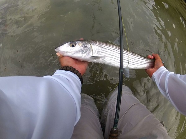 I walked the flat twice, securing bonefish number two on the second trip. The flat is ideal to walk since the sun and wind are at your back. The difficulty is in seeing the fish. On day two, I spent most of my time looking for a darker shape along the turtle grass bottom because that was what they looked like last year. With partly cloudy skies, high winds, and cresting waves it was very difficult to see a lone fish approaching from a far. When I finally saw the big guy he was a lighter color, which surprised me. Often you need to know what to look for before you actually see it. With that image in my mind I headed out on day three with cloud cover and the aforementioned winds and waves. I spotted a bonefish along the mangrove glide over a three foot patch of sandy bottom. A long cast landed a few feet away and I immediately tied into a different fish. The invisible one over the turtle grass bottom. I didn’t complain because with bonefish, more than any other species, you often catch the one you can’t see, even if you know what you are looking at.