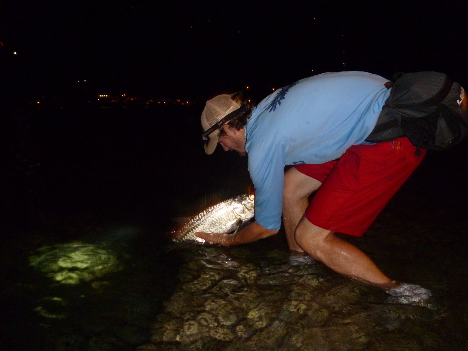 Arriving at the honey spot, a quick spot with a flash light reveals a field of glowing eyes. The guys freak out and rig up some new prototype rods from Loop and on Stephan’s first cast he jumps one. On the second he is doing battle with a nice 40 pound fish that comes off after touching the leader. Joining the fray I hook into my largest fish of the trip thus far and after a long grueling battle, he too pops off during the landing attempt. For the next several hours we fish into the night, working our way up and down a rocky coastline in pitch blackness, wading in shark infested waters, all for a chance at the silver king.