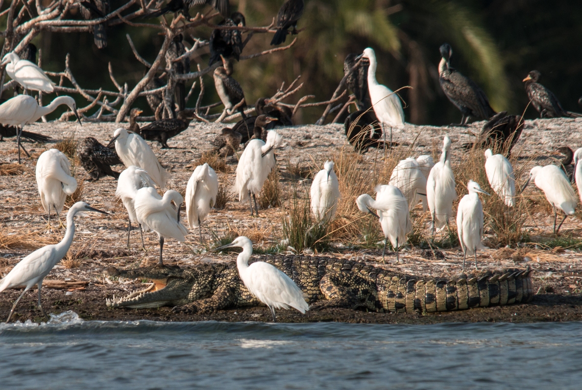 Snowy Egrets, Long-tailed Cormorants and a Nile Crocodile